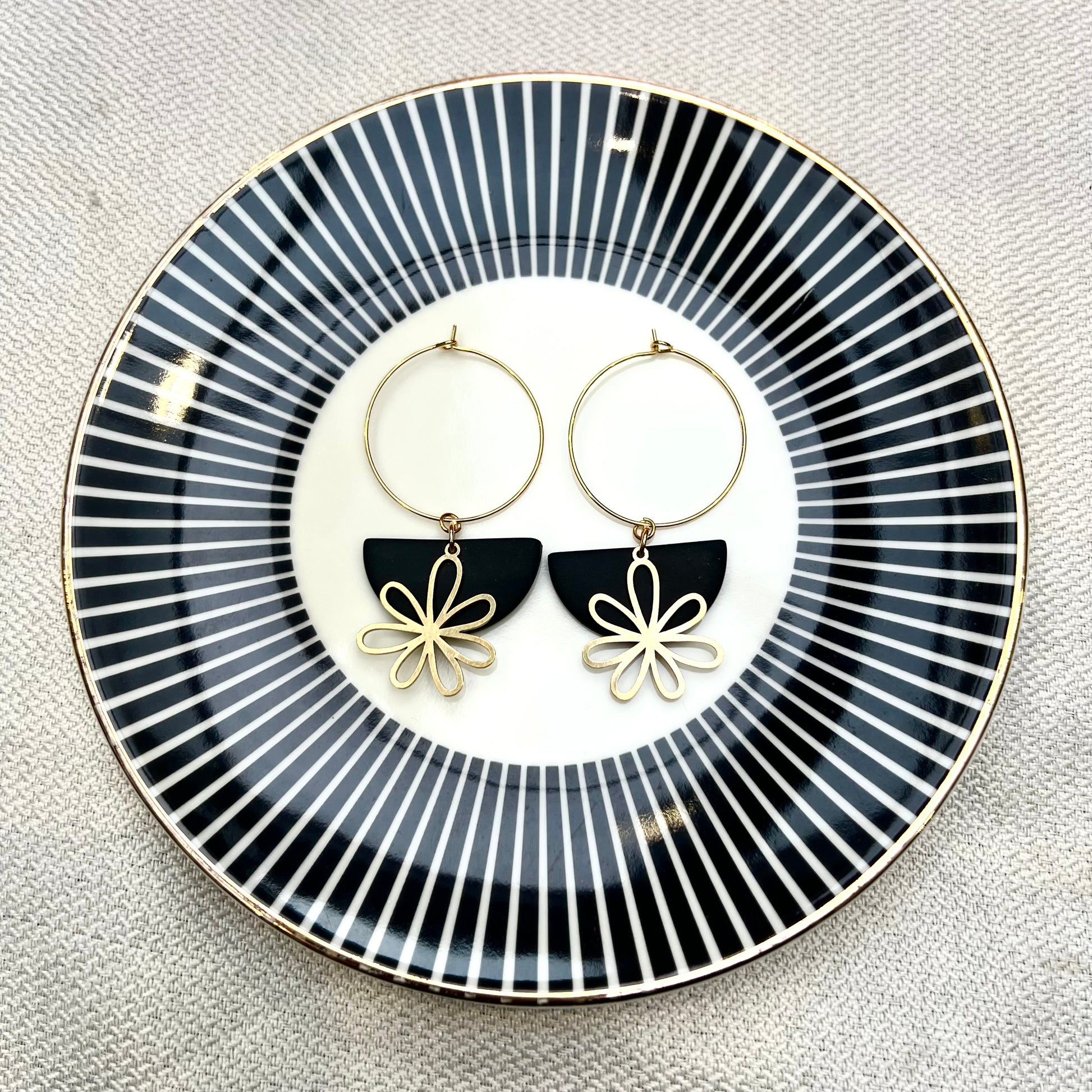 Dangle hoop earrings with a red semi-circle and textured brass charm.